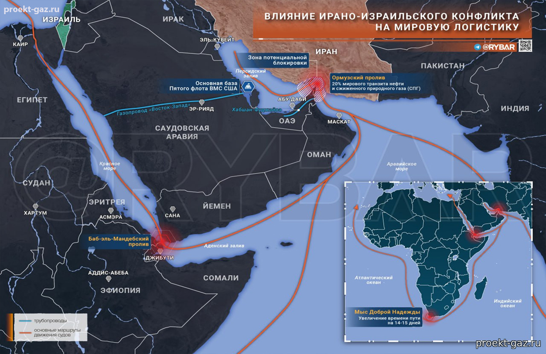 Ормузский пролив соединяет Персидский залив с остальным миром и является фактически единственным морским маршрутом для нефти и СПГ из Катара, а также существенной части экспорта Ирака, Кувейта, Ирана, ОАЭ и Саудовской Аравии. Через этот узкий коридор проходит примерно пятнадцать процентов мирового морского экспорта нефти и около двадцати процентов сжиженного газа.